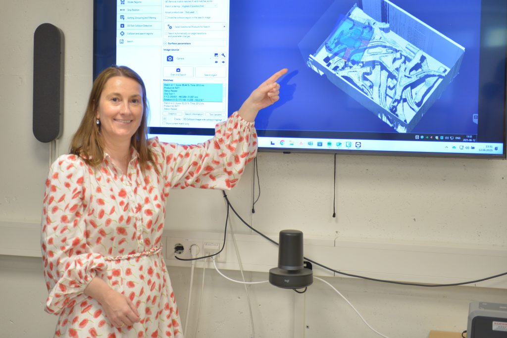 – Vi lærer opp roboten til å kjenne igjen fasongen til de ulike delene. Dette skjer i 3D, slik at den tar også høyde for ulik høydefasing. Deretter læres roboten opp til å finne riktig gripepunkt, forklarer Bonkerud og viser frem programmet dette gjøres i.